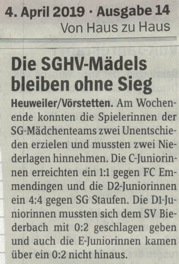 Damit endet die vierjährige Geschichte der Mädchenteams der DJK Heuweiler, die mit zwei Mädchen, Hanna und Frieda, im Sommer 2015 auf dem Sportplatz Heuweiler begonnen und zu drei in Heuweiler spielende Mädchenteams mit 30+ aktiven Spielerinnen geführt hat, mit der Diskussion über die Übernahme der letzten Turnierkosten. Die Mädchen verabschieden sich in die Sommerpause und vom DJK Heuweiler und gehen in der kommenden Saison unter dem Dach des VfR Vörstetten wieder an den Start der neuen Saison 2019/20.